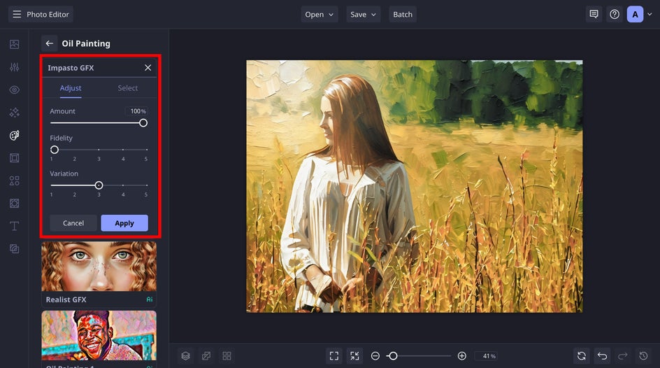 For this example, we will use the Impasto GFX. This style of painting is known for its textured appearance – thick layers of paint to the point where you can see the brush or palette knife strokes, giving the image a three-dimensional look.