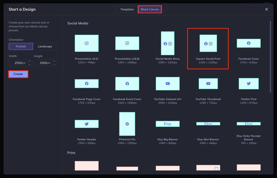 You can either start with a Blank Canvas or choose a Template. We are going to start with a Blank Canvas this time, since our article linked above chose a Template. We are going to be creating a typographic inspirational quote, so we won’t be using or needing any photos. If you choose the Template option, select the Social Media option in the left-hand menu, and then select Instagram Posts. Choose the template you want and then follow this tutorial here to make your customizations. For this tutorial, let’s start with a Blank Canvas and then select Social Square Post.