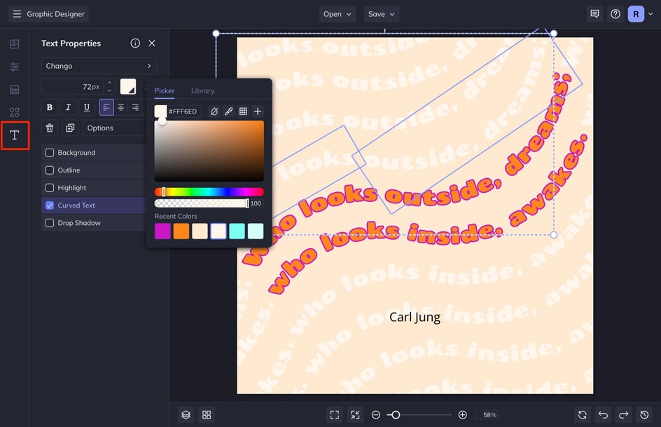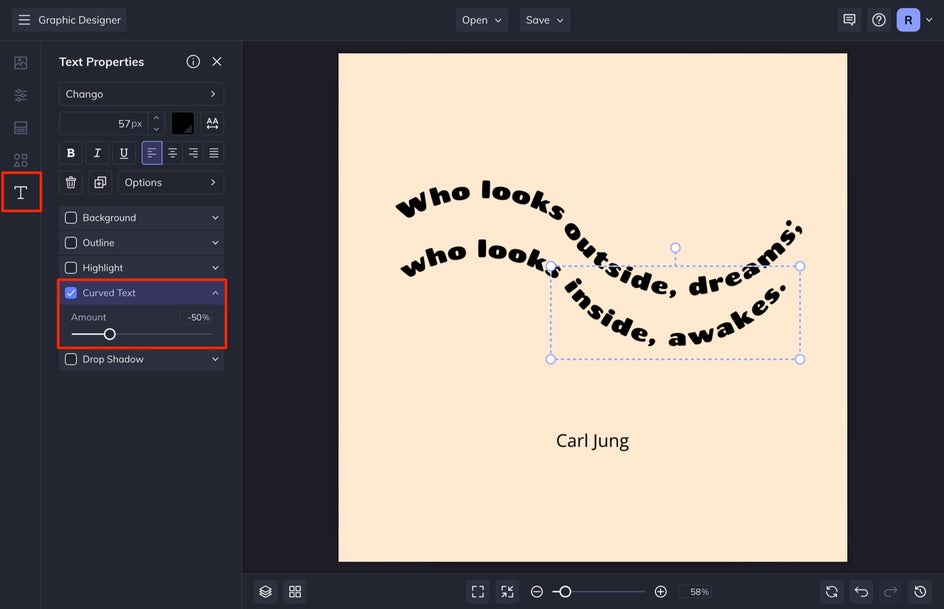 We are going to make a curved text design, so follow along if you want to find out how to do that. If you want to keep your design quick and simple, choose your Font, select the Color, adjust other customizations like Outline and Drop Shadow, and move on to Step 5. Don’t forget to add the author and select a sans-serif font to pair with the overall design.