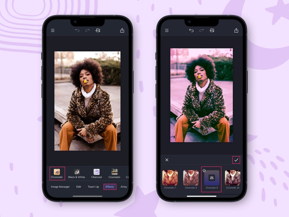 You can easily change how intense this Effect is using the adjustment slider. Chromatic 9 uses just one slider, but many other Effects also allow you to edit the specific level of highlights and shadows, and can even be used to adjust colors.