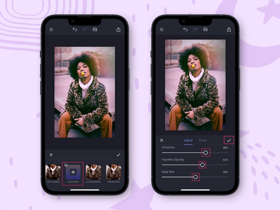 Another distinct aspect of film photography are distortions and vignettes. These usually occur when using an incorrect lens for the subject you’re shooting. You can use the Anamorphic Effect, found under the larger group of Cinematic Effects, to recreate both “mistakes” at once. The level of distortion, vignette, and blur can be manually adjusted until your photo looks imperfectly perfect.