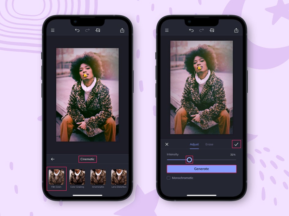 Lastly, film grain or “noise” is an essential part of the classic film aesthetic. This grain is caused by the silver particles used in celluloid and greatly contributes to the texture and warmth of a film photograph. You can use the Film Grain Effect, also found under Cinematic Effects, to recreate this aesthetic perfectly. This noise is randomly generated so that the film grain looks different and natural every time.