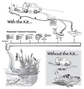 Car wash kits work by redirecting dirty water – polluted with soap, oil and automotive fluids – away from the storm drain. The kit uses a hose to connect to a toilet, sink or drain that sends the water to the wastewater treatment plant. When you don’t use a car wash kit, the water runs off the driveway, parking lot, or street into a storm drain and directly into our streams, lakes, and rivers. Those pollutants damage water quality and poison fish and other animals.