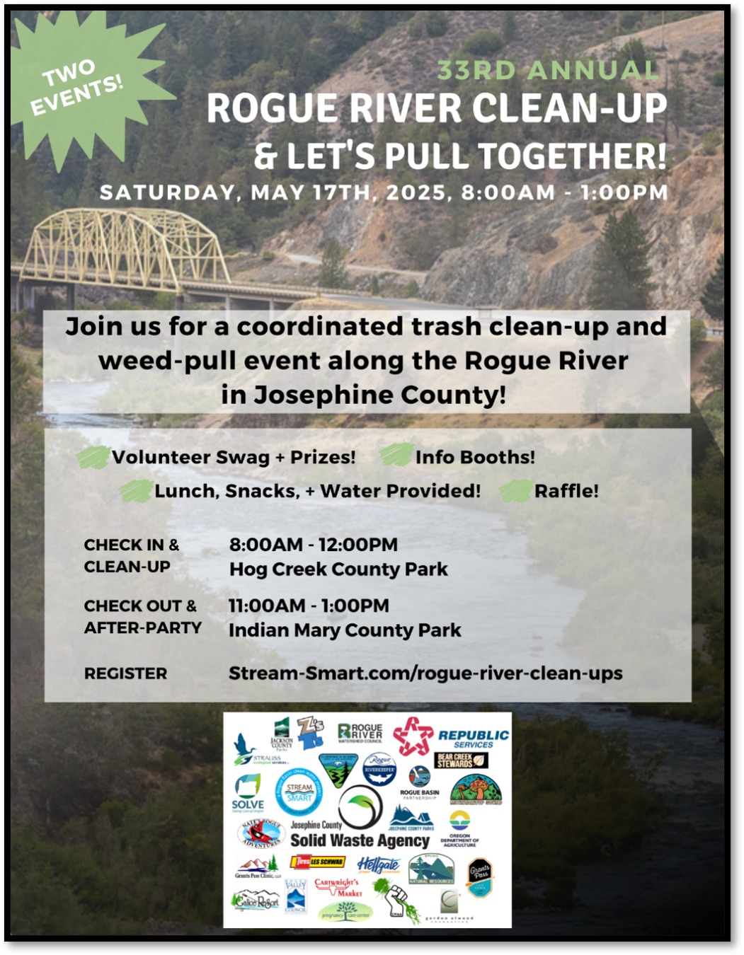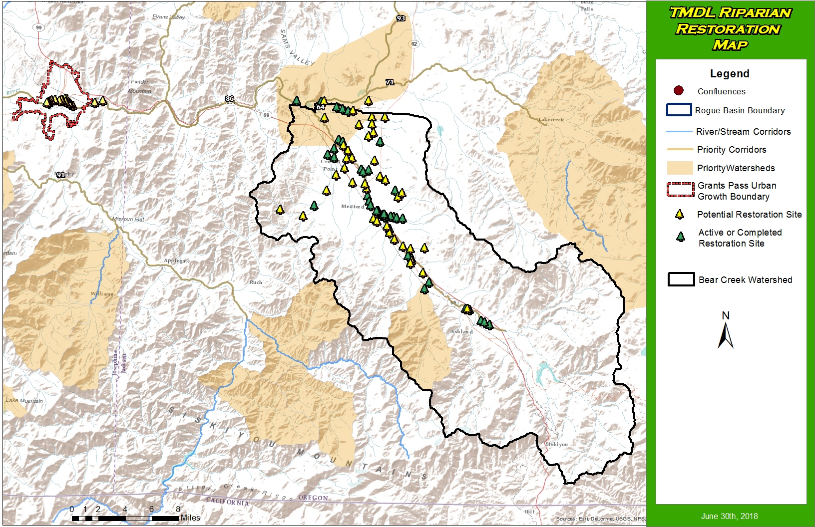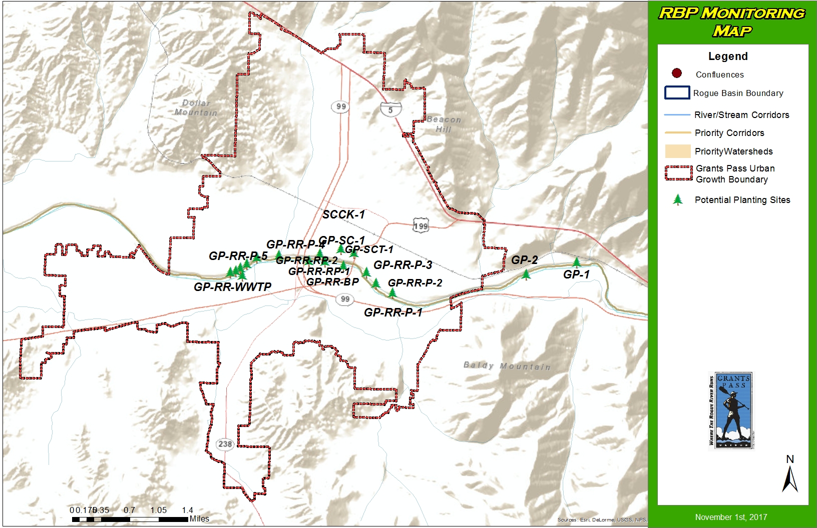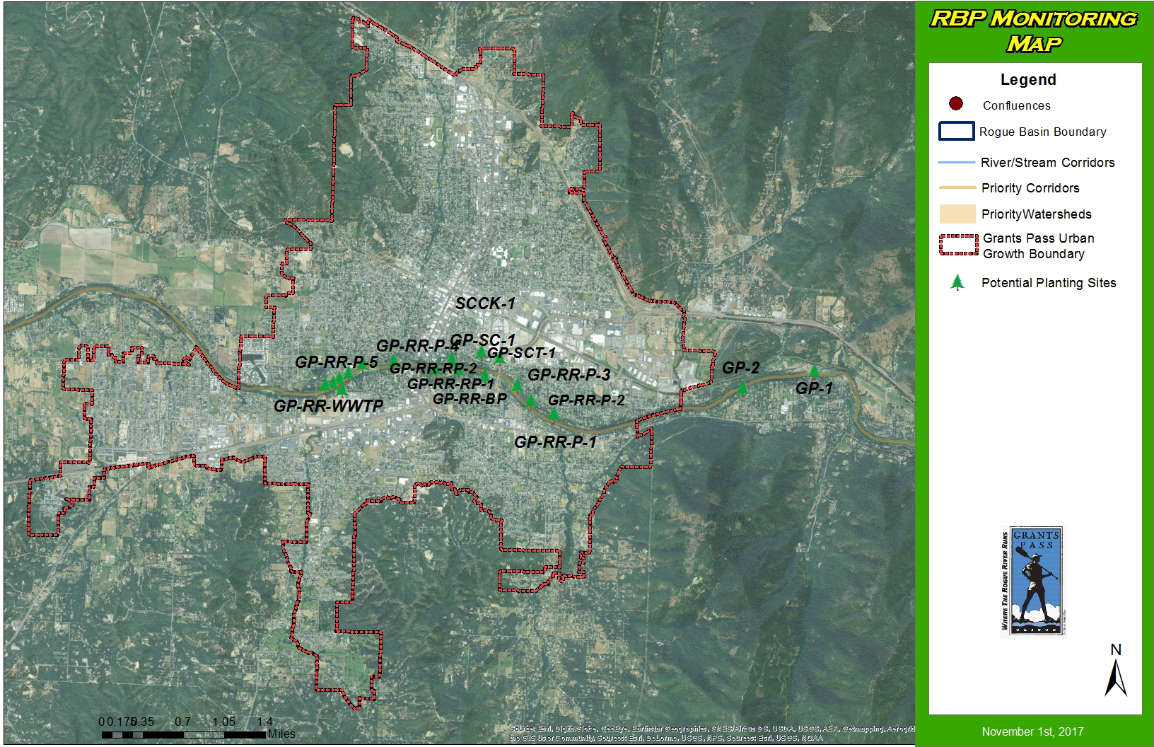 The City of Grants Pass is implementing a comprehensive program to meet the Rogue Basin Total Maximum Daily Load (TMDL) program of the the Clean Water Act to reduce temperature and bacteria inputs within the City limits and Urban Growth Boundary to the Rogue River and its tributaries (e.g., Skunk, Gilbert, Fruitdale, Jones, and Sand creeks). Strategies include riparian restoration to improve stream shade, managing urban runoff to reduce pollution, conducting community education and outreach programs, and erosion prevention and sediment control. Strategies are being implemented individually and in partnership with the County and the Bear Creek Designated Management Areas (DMAs). Planned strategies are outlined in a DEQ-approved plan that is implemented over a 5-year period. After 5 years, plans are reviewed, and revised and updated as need for the next 5-year period until water quality standards are met. Implementation of the program will be completed by the City, contractors, partner organizations, the public, schools, colleges, and other groups. Plans are currently being updated for the next implementation period starting on July 1st, 2025.